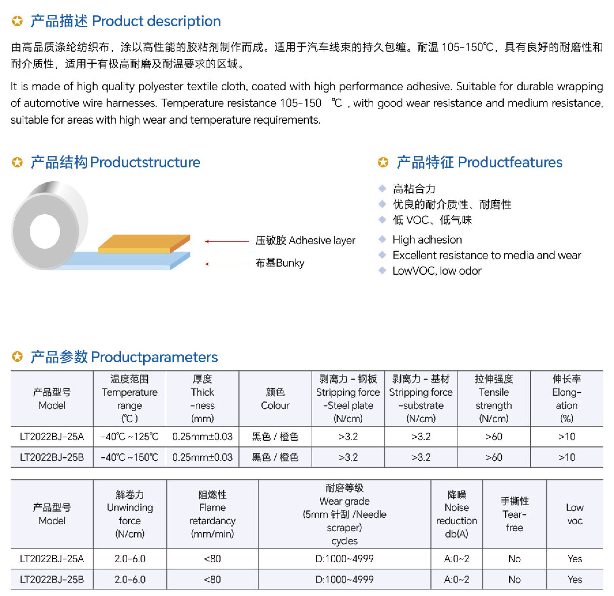 由高品質滌綸紡織布,涂以高性能的膠粘劑制作而成。適用于汽車線束的持久包纏。耐溫105-150℃,具有良好的耐磨性和耐介質性,適用于有極高耐磨及耐溫要求的區域。